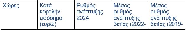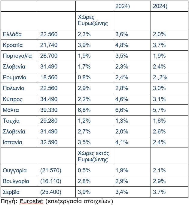 Ενώ, λοιπόν, η συνολική εικόνα είναι ότι την τελευταία εικοσαετία, πράγματι όπως προβλέπει η, επιβεβαιωμένη από τα επιτεύγματα των ασιατικών χωρών οικονομική θεωρία, (convergence theory ή catch-up theory), η ομάδα των φτωχών χωρών της ευρωζώνης και της ΕΕ διαχρονικά τείνει να συγκλίνει προς το επίπεδο εισοδήματος των πλουσίων χωρών, έστω και αν ακόμη απέχει αρκετά από αυτές, εντός της συγκεκριμένης ομάδας χωρών, η Ελλάδα δεν παρακολουθεί την κοινή πορεία, “βραδυπορώντας” και αποκλίνοντας προς χαμηλότερα συγκριτικά επίπεδα, χάνοντας την θέση που είχε στην αρχή της περιόδου δηλαδή το 2005, στην μεγάλη διεύρυνση της ΕΕ. Και, όπως δείχνει ο πιό κάτω πίνακας, αυτό δεν αλλάζει ουσιαστικά την τελευταία υποπερίοδο. Όπως φαίνεται, σε μέσο όρο εξαετίας, από το 2019 έως το 2024, η Ελλάδα πάλι υπολείπεται του αναπτυξιακού ρυθμού σχεδόν όλων των χωρων της “φτωχής Ευρώπης”, υπερέχουσα μόνο, εντελώς οριακά, της Τσεχίας και της Πορτογαλίας, (οι οποίες, βεβαίως, την περασμένη δεκαετία την ξεπέρασαν σε κατά κεφαλήν εισόδημα).